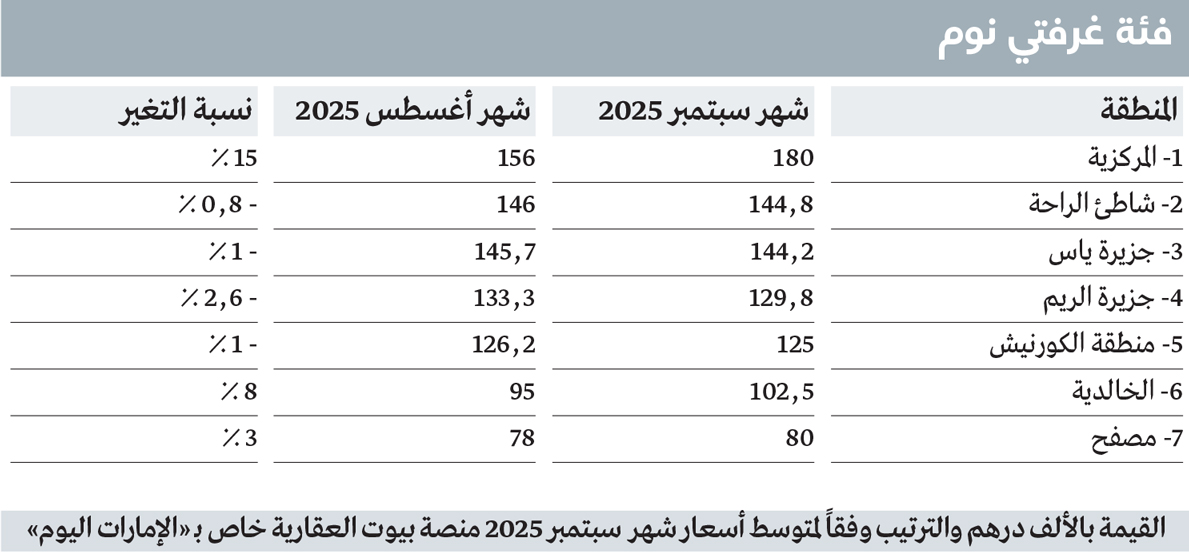 The data showed the average annual cost of the annual lease of an apartment composed of a bedroom and a hall in the “Raha Beach”, “Mossafah”, “Central” and “Al -Reem Island” during September 2025 compared to last August at 8.5%, 3%, 2% and 0.4%, respectively, while the average annual cost of the bedroom of a bedroom and a hall in the Khalidiya, Corniche and Yas Island regions decreased by 18%, 1.3%, and 1.2%, respectively.