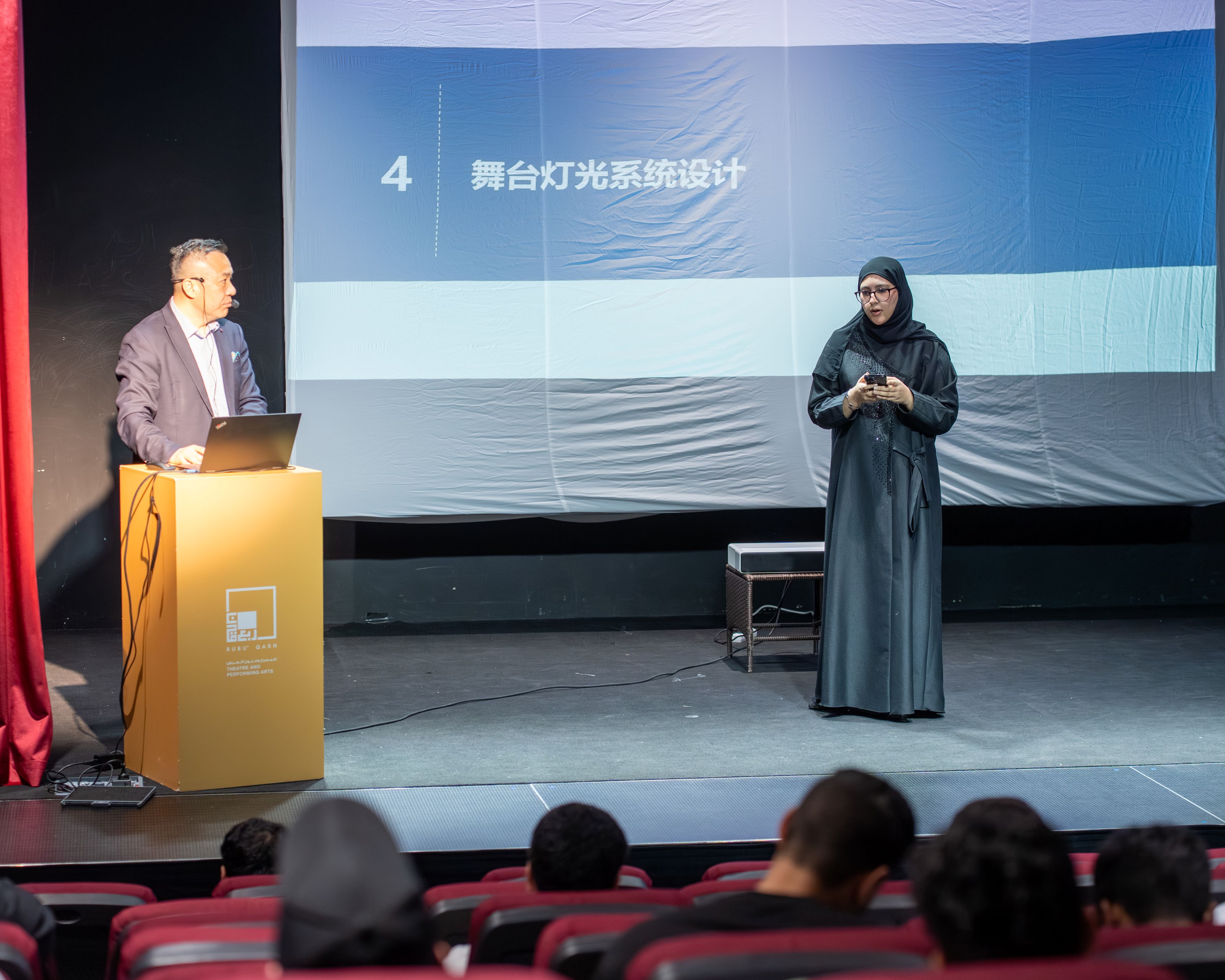 Participating in this stage were Yi Yuping, Chairman of the Yinchuan Theater Design Authority, Deputy Director of the Chinese Scenographic Society, and expert Zhang Xinfeng, member of the Chinese Scenographic Society, who are considered among the prominent figures in the field of theater design and technology in China.